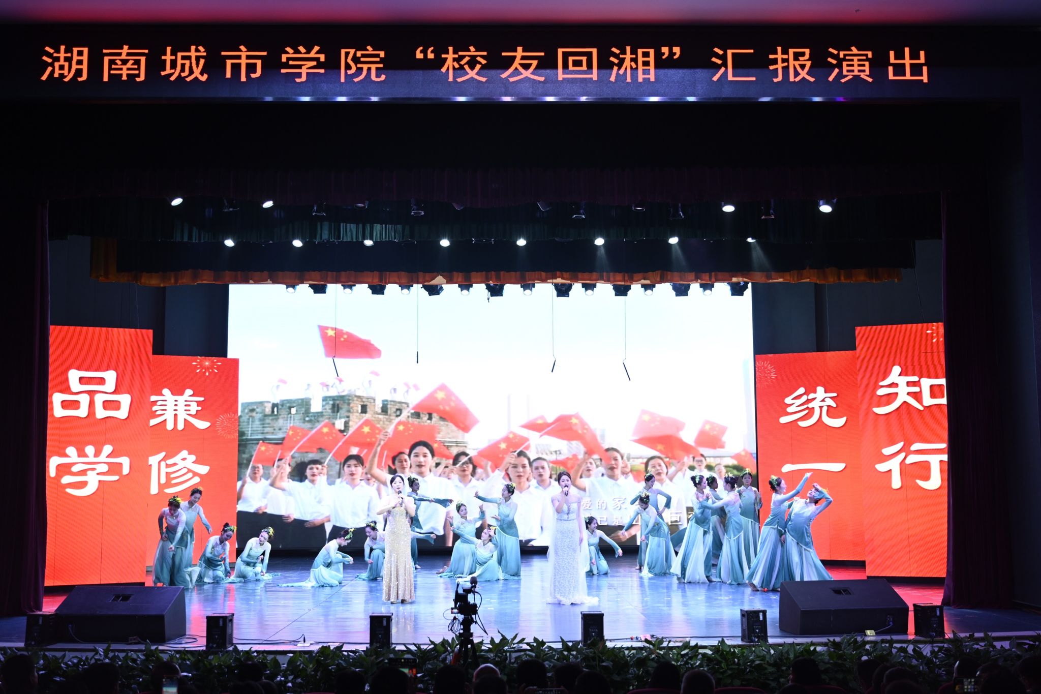 歌曲《山乡巨变》的名字来源于益阳知名作家周立波同名书籍,以资水之畔的益阳为背景,生动唱出了城市日新月异的变化与光明美好的未来;在情景诗《光辉历程》的演绎中,朗诵者声情并茂、抑扬顿挫的朗诵,与别具一格的绘画及书法作品相得益彰,共同绘就了城院55年办学征程中“与时代同频共振”的优异答卷。